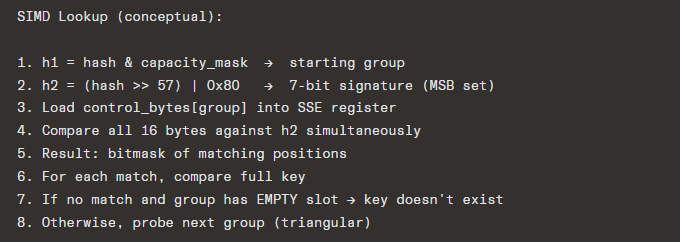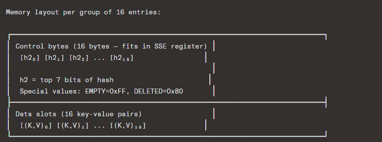 - Probing uses SIMD: load all 16 control bytes into a 128-bit register, compare against h2 with a single instruction, get a bitmask of matching slots