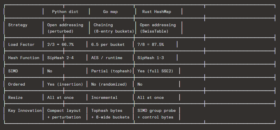 The research goes further by examining how three major programming languages implement hash tables in practice. Python‘s dict uses a compact open-addressing scheme with perturbed probing that preserves insertion order. Go’s map employs a unique hybrid of chaining with 8-entry buckets and top-hash bytes for fast rejection. Rust‘s HashMap, built on Google’s SwissTable design, represents the state of the art — using SIMD instructions to probe 16 slots simultaneously through carefully designed control byte metadata, achieving remarkable performance at load factors as high as 87.5%.