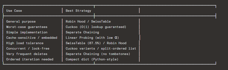 | Linear Probing | 0.5 – 0.7 | Clustering degrades rapidly past 0.7 |