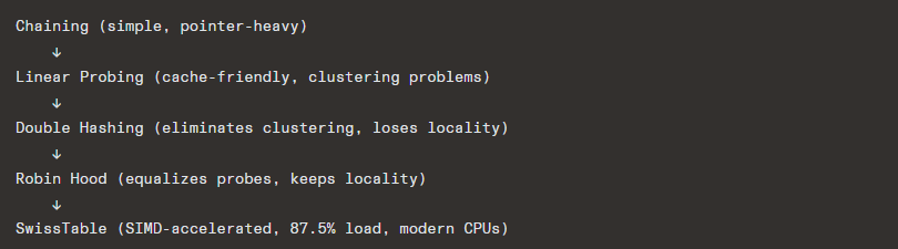 The evolution of hash tables tells a story of trading complexity for performance: